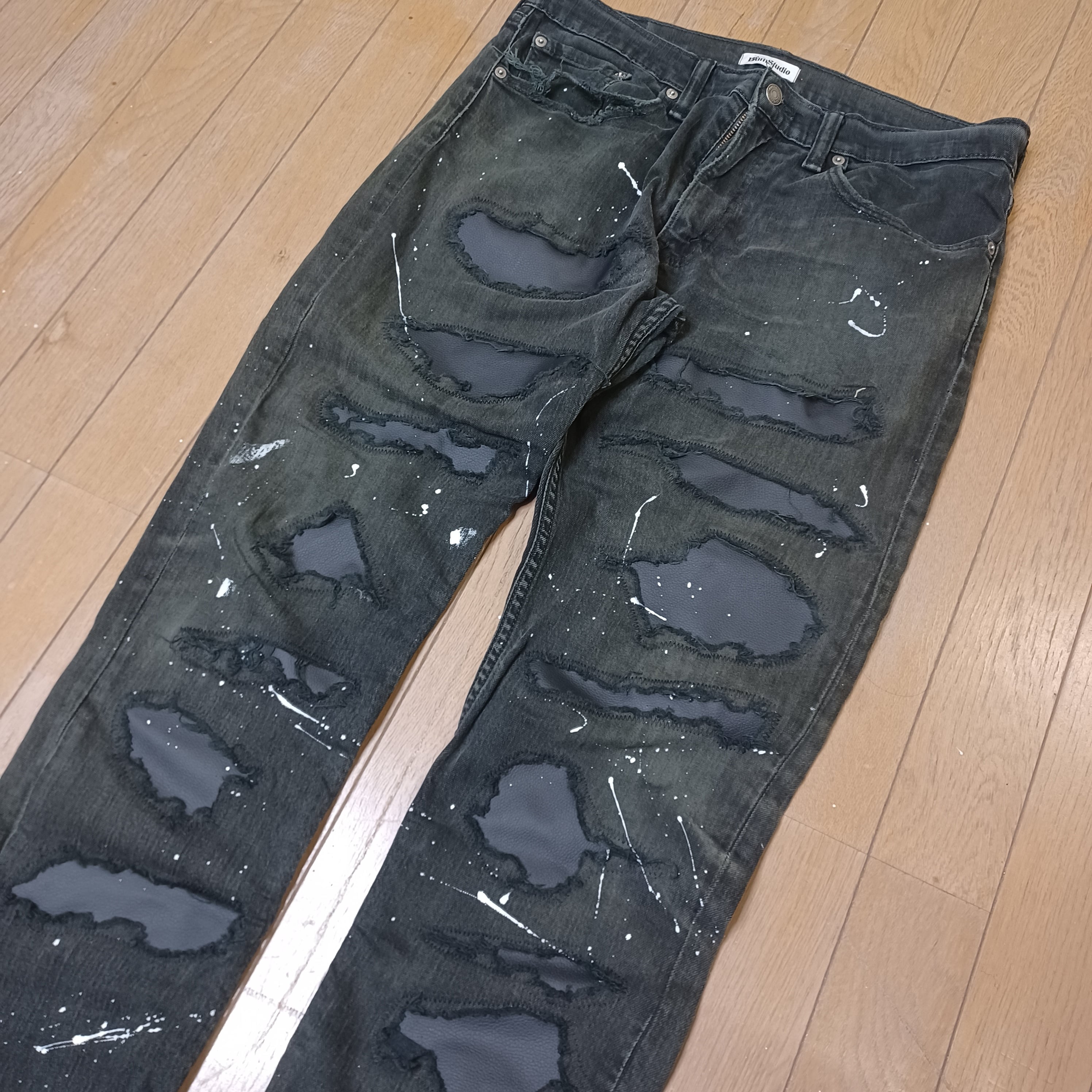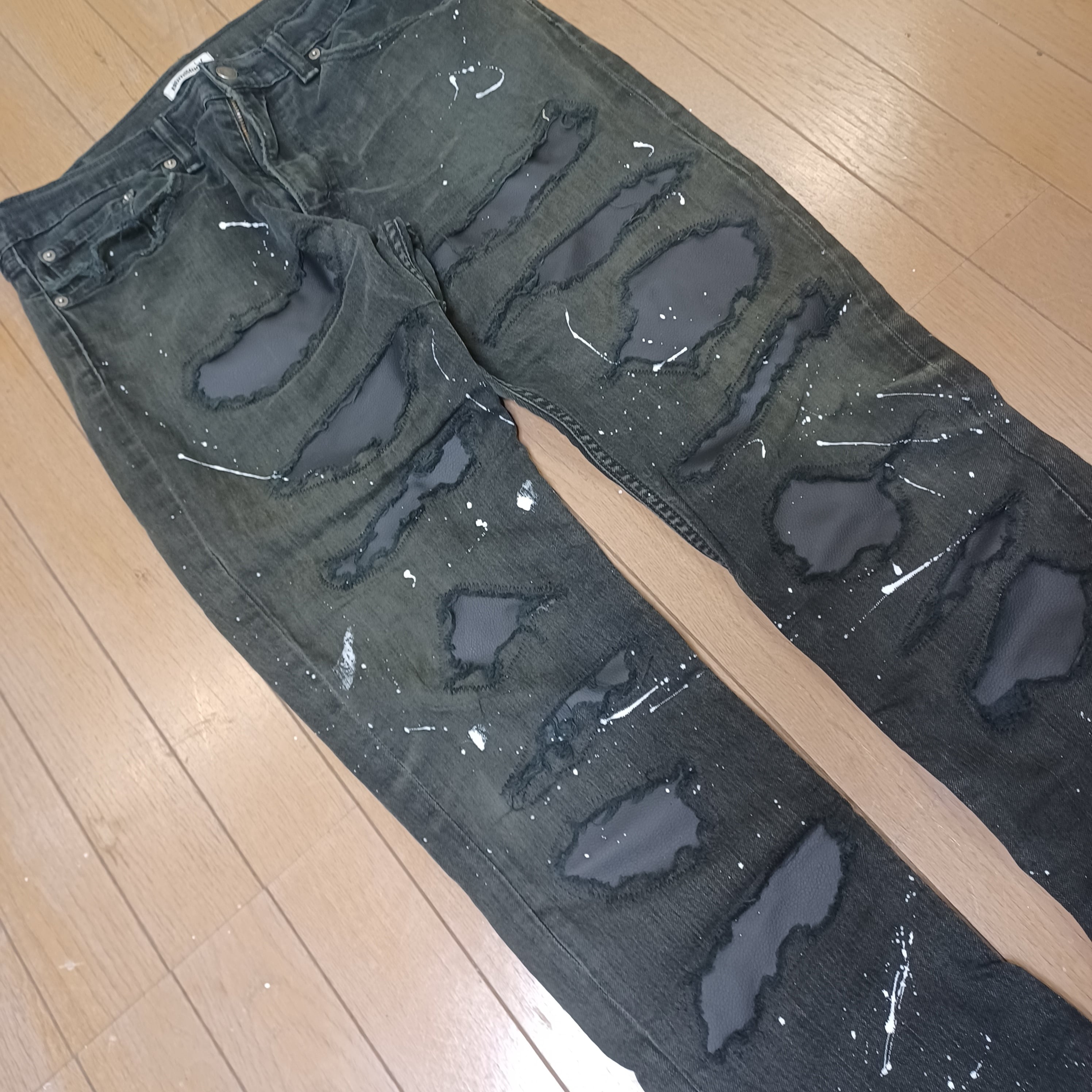 ヴィンテージLevi'sのブラックデニムをベースにダメージ加工、ミシン加工、ペイント加工を施しました。