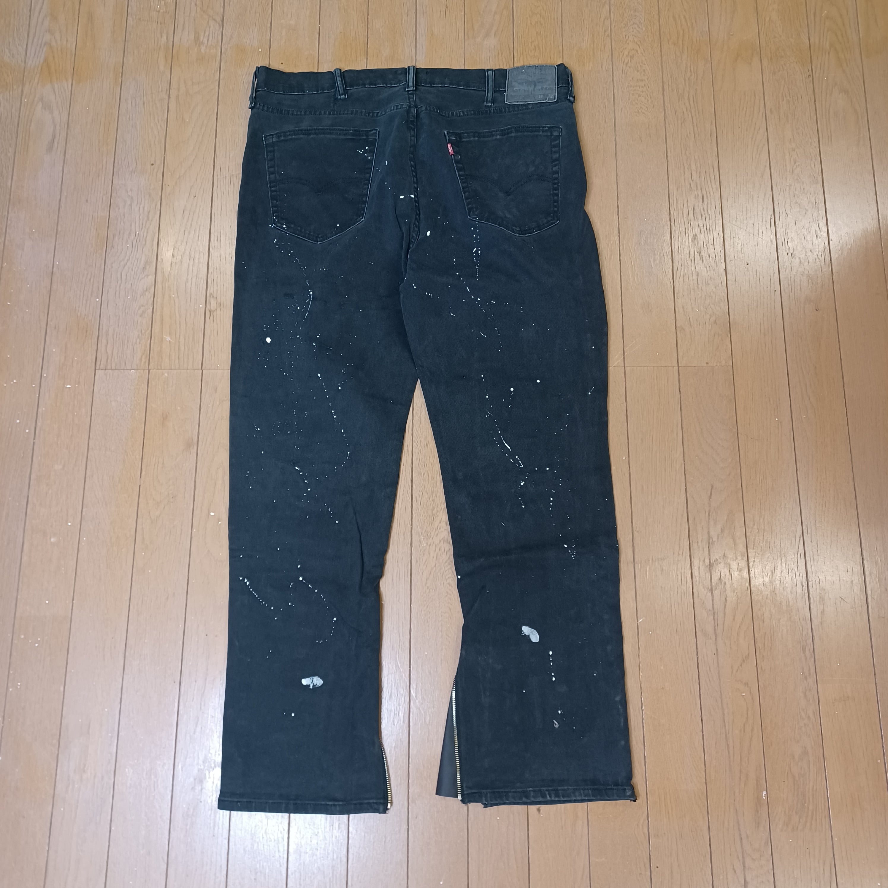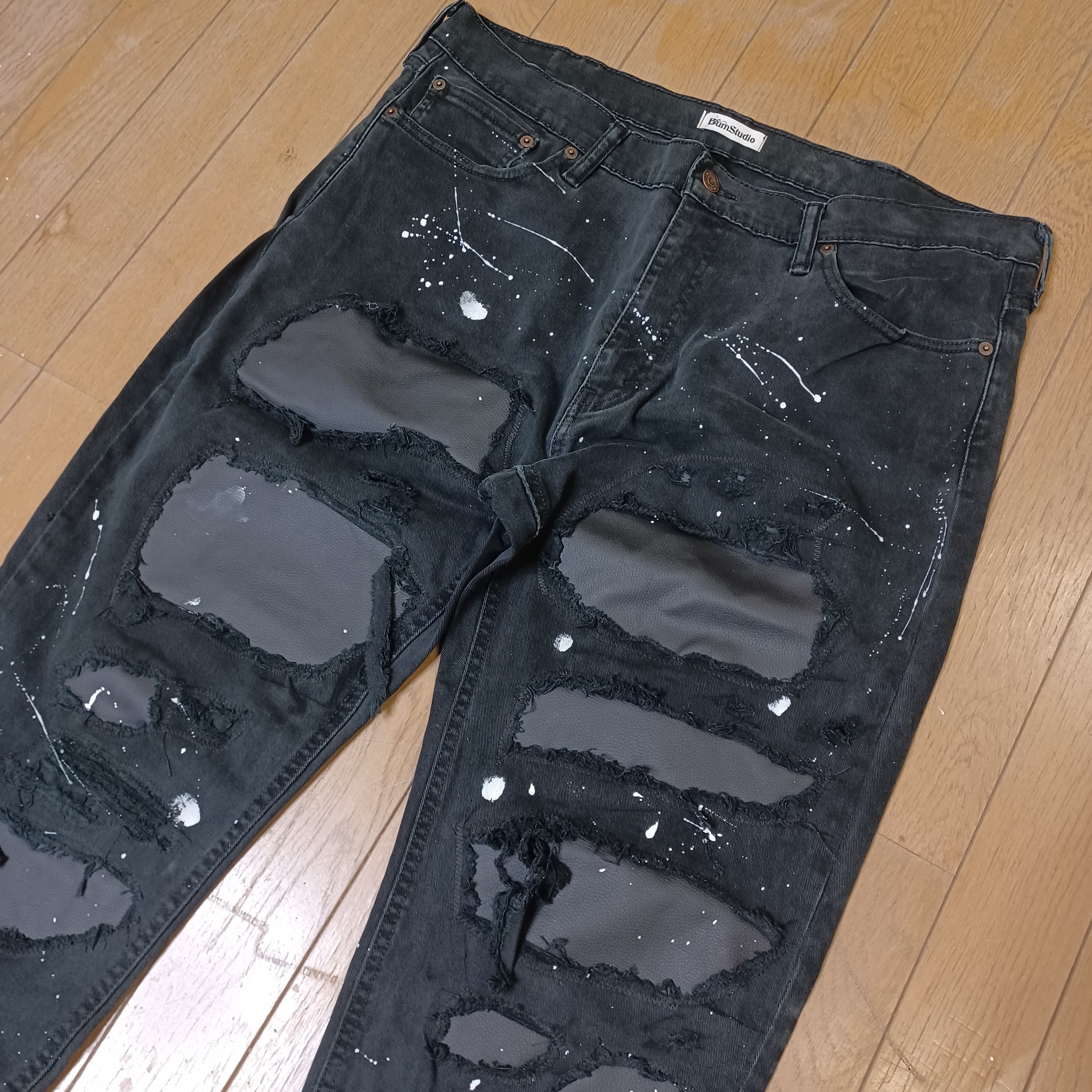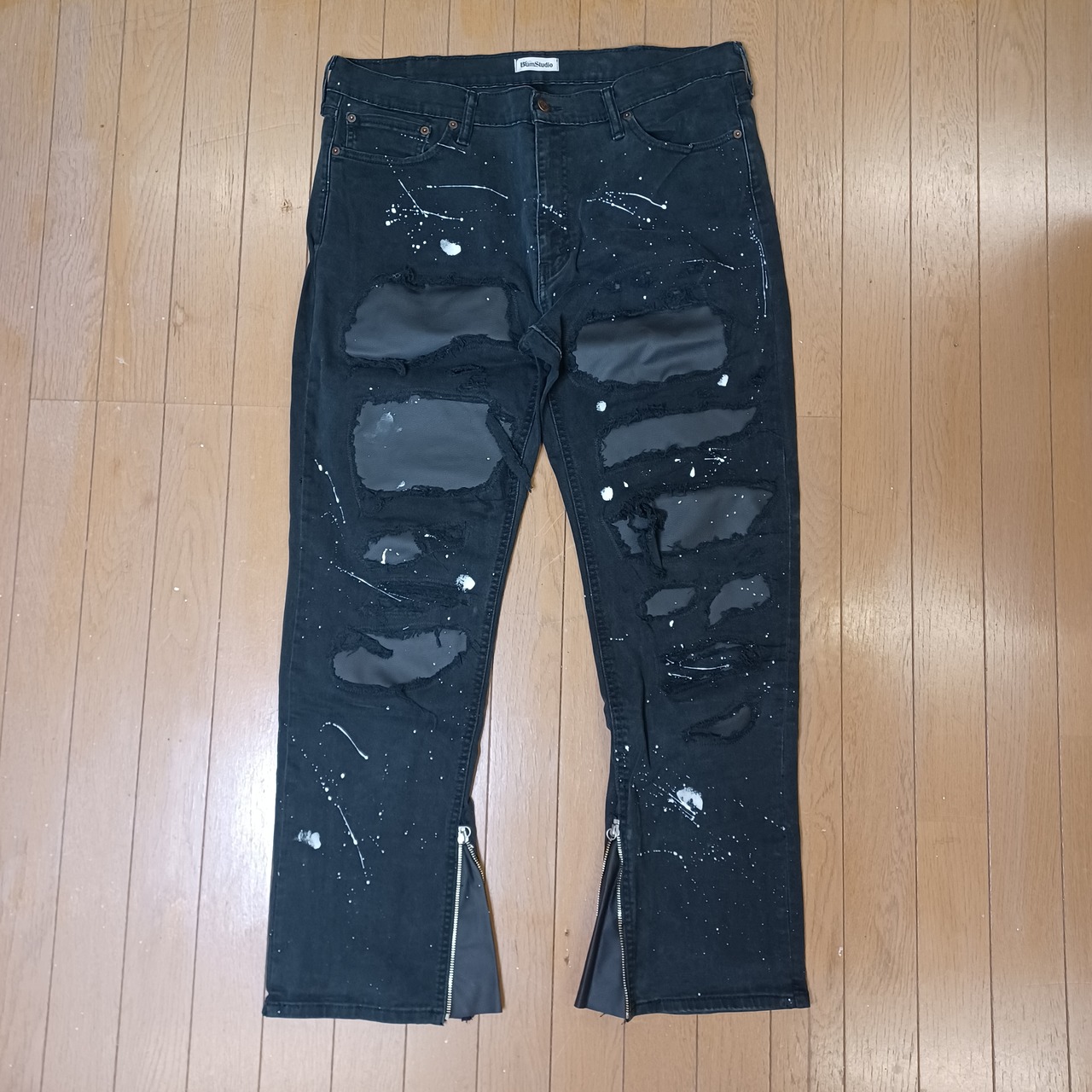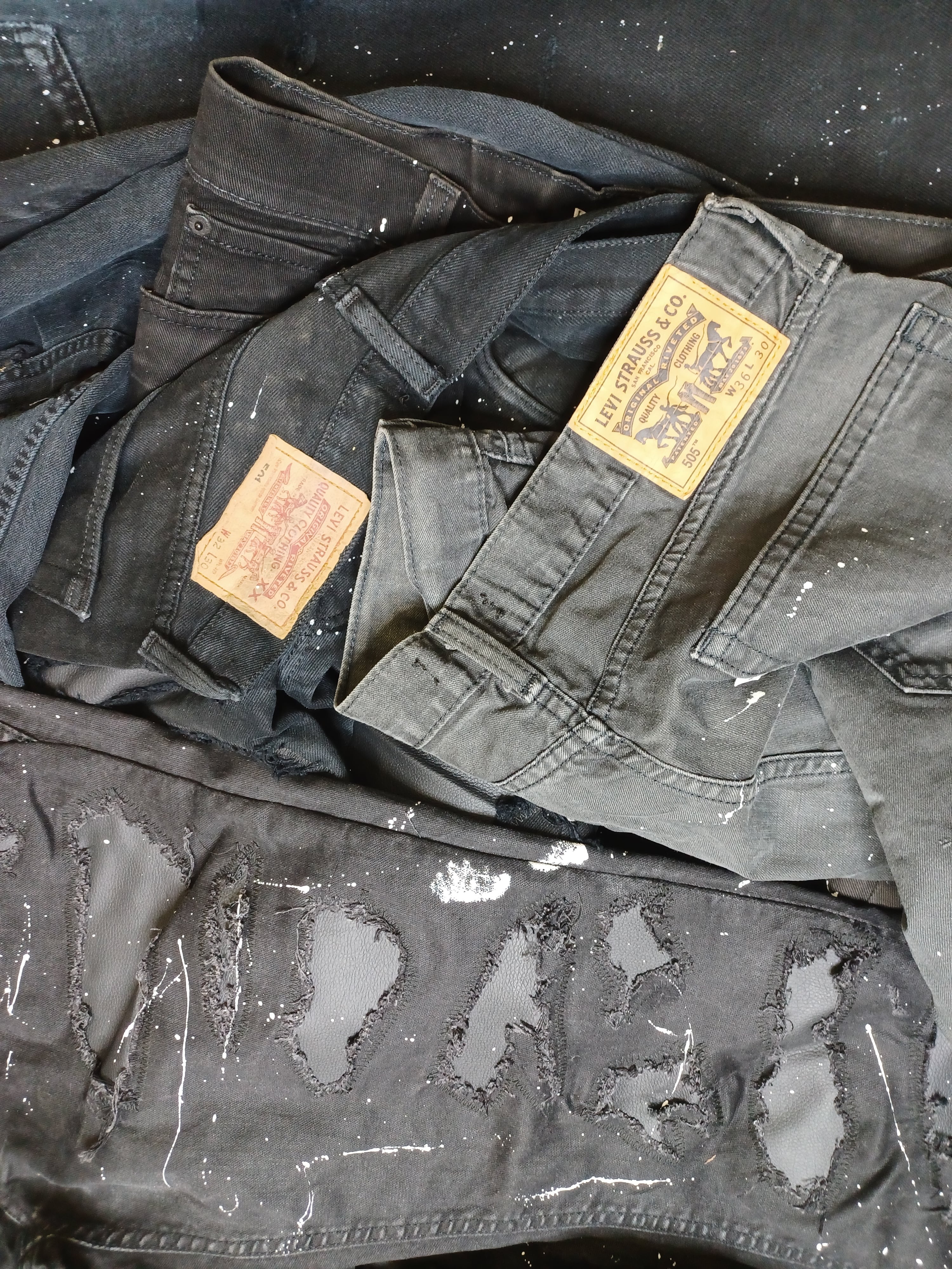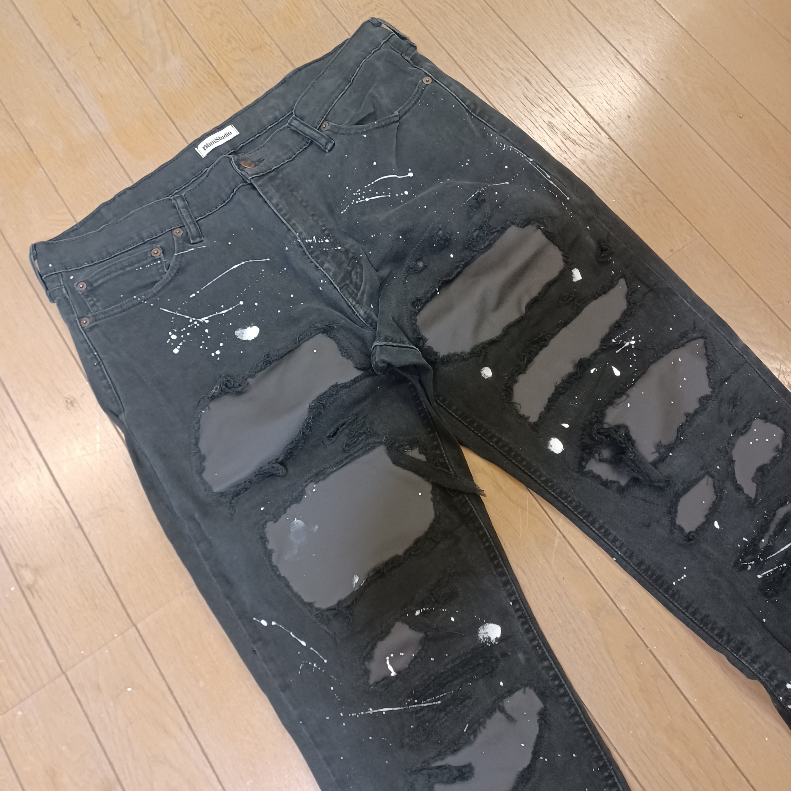 ヴィンテージLevi'sのブラックデニムをベースにダメージ加工、ミシン加工、ペイント加工を施しました。