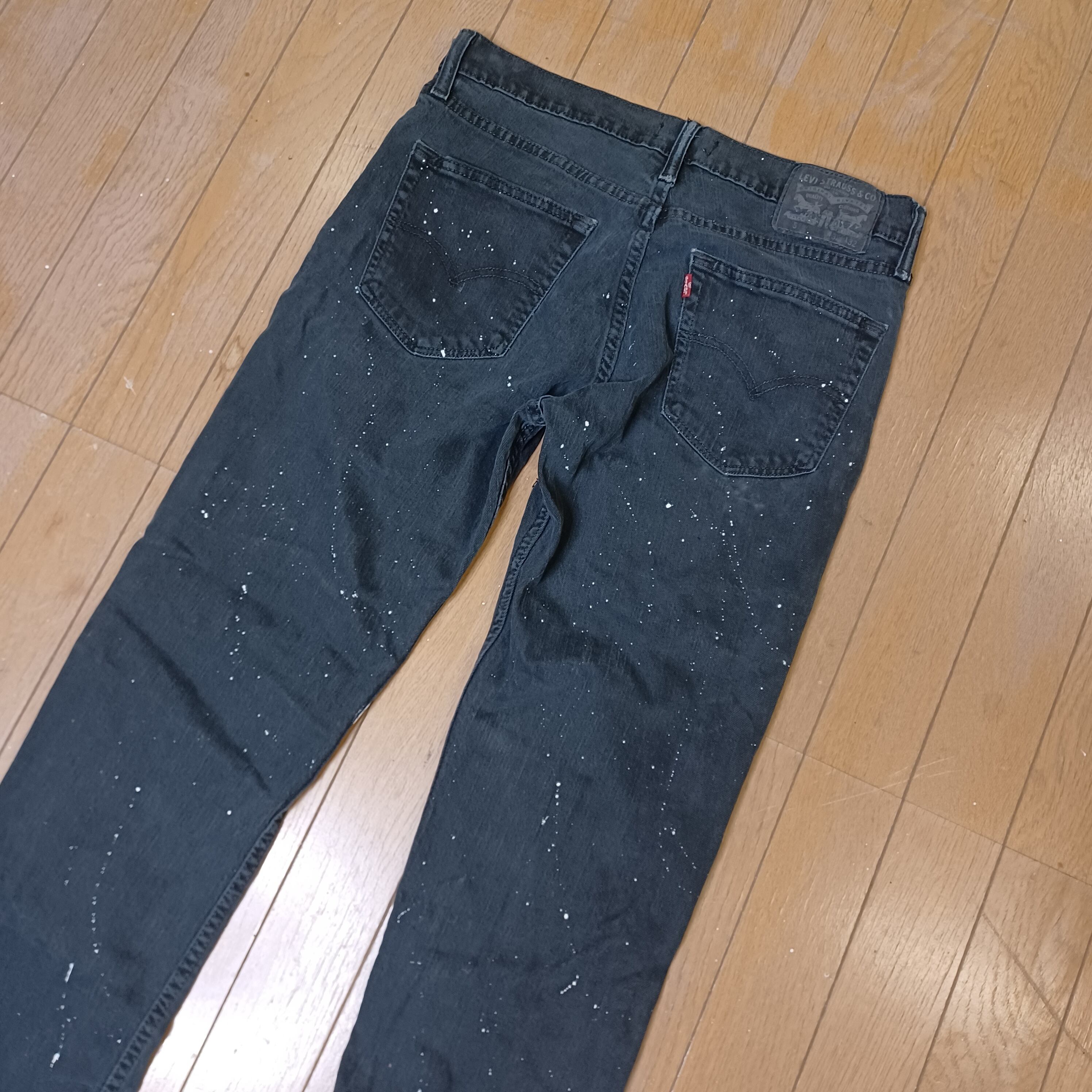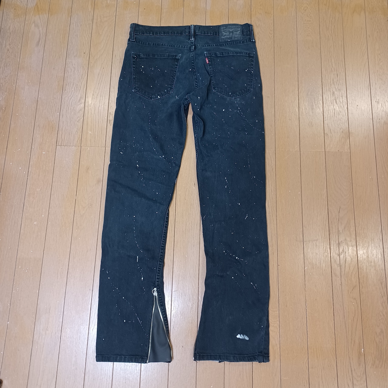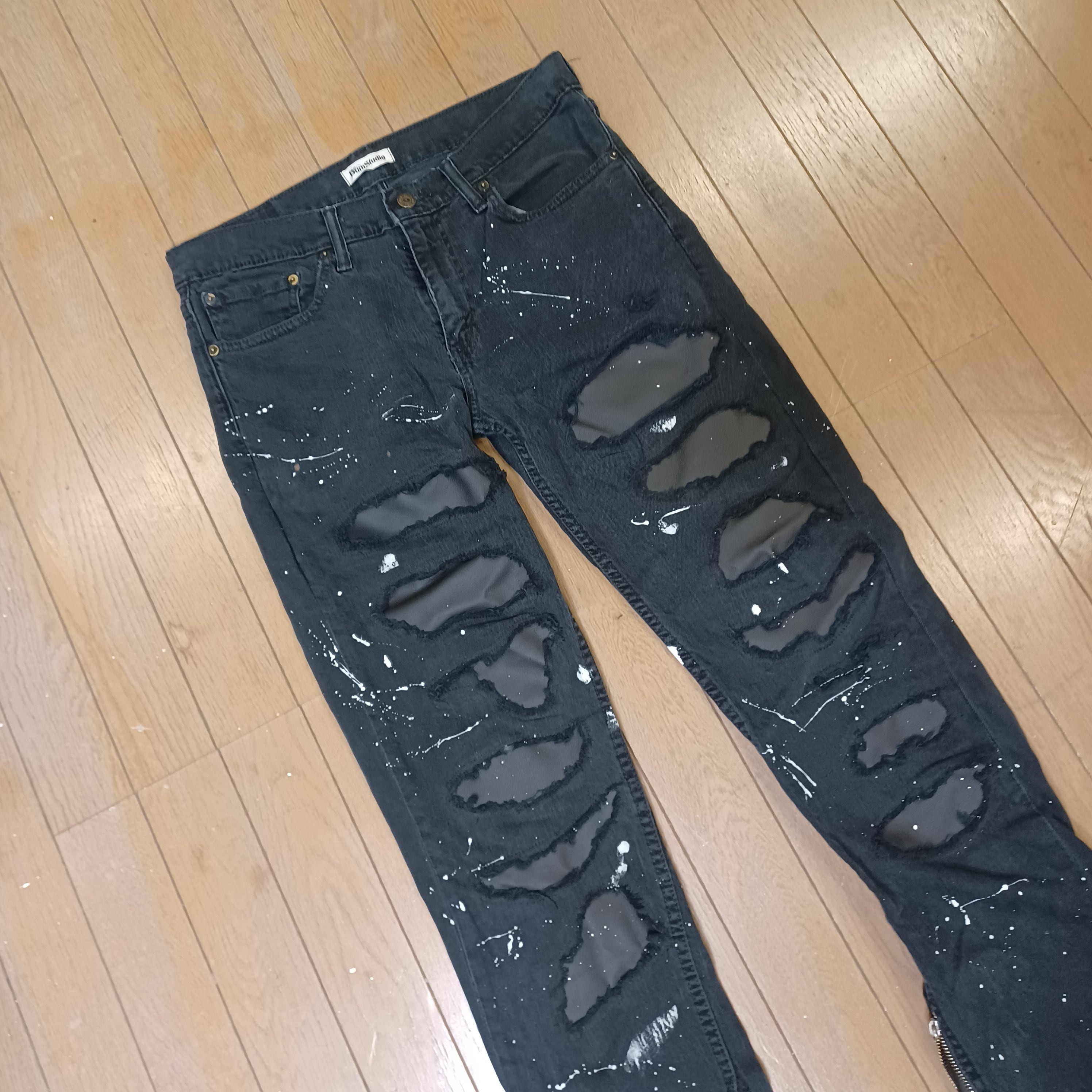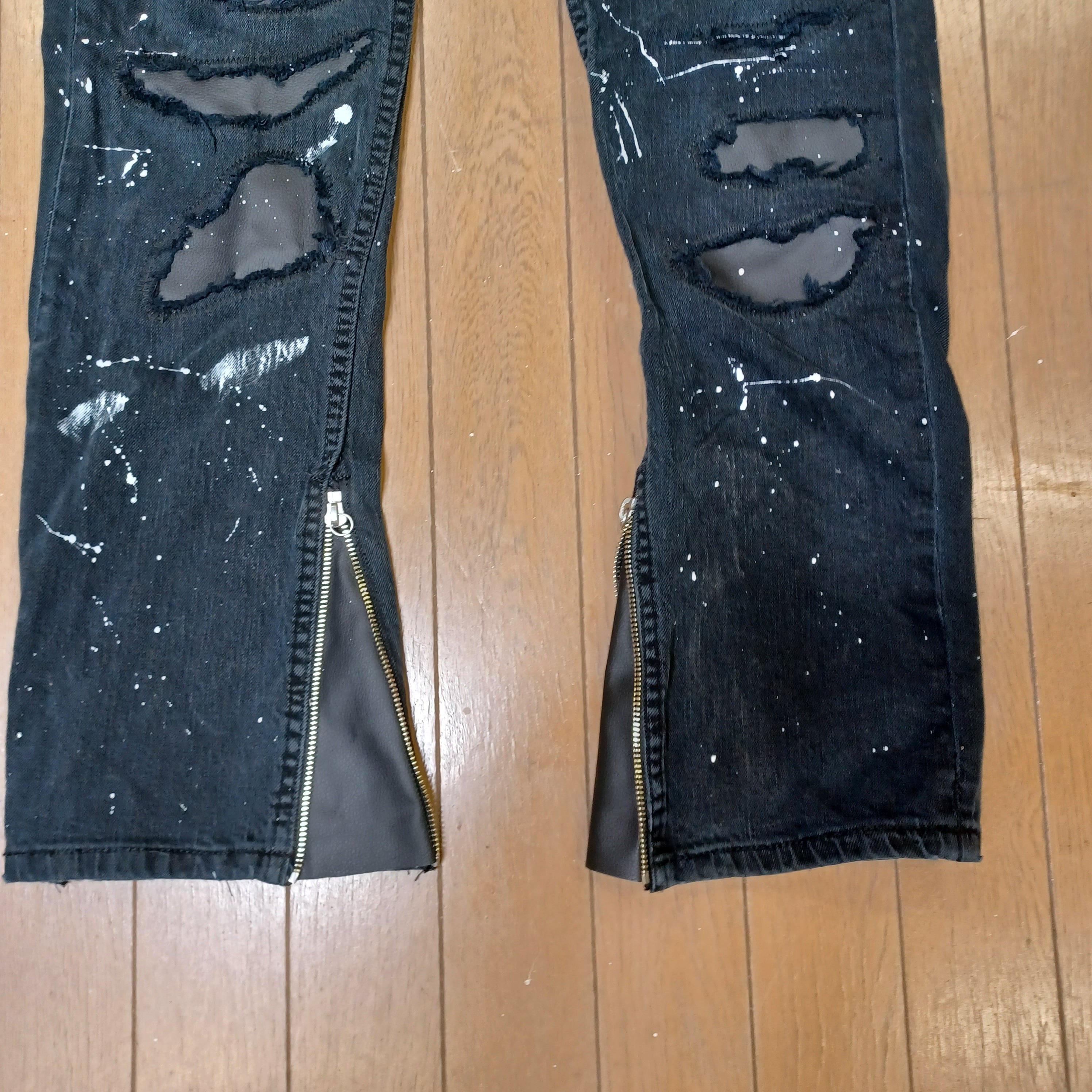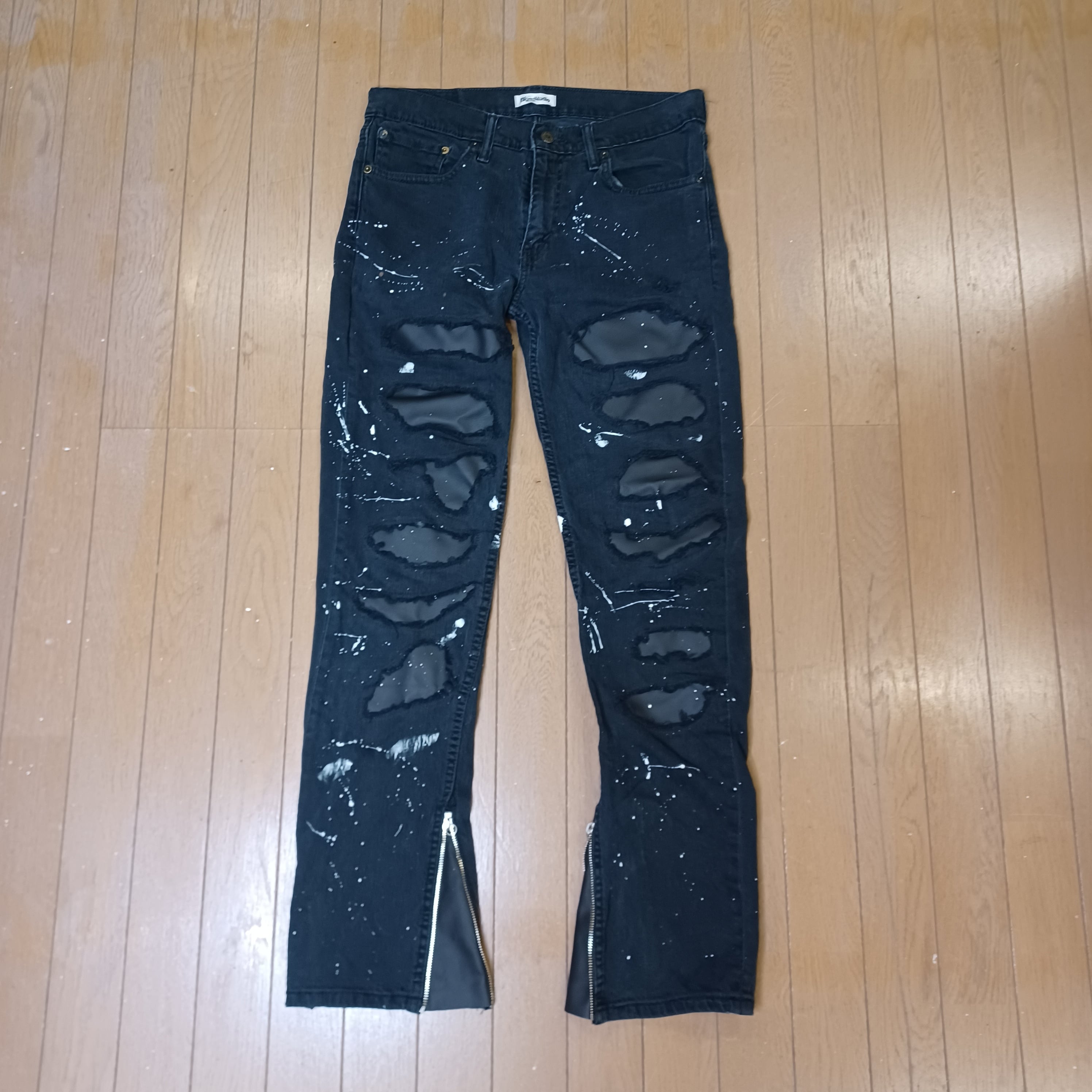 ヴィンテージLevi'sのブラックデニムをベースにダメージ加工、ミシン加工、ペイント加工を施しました。