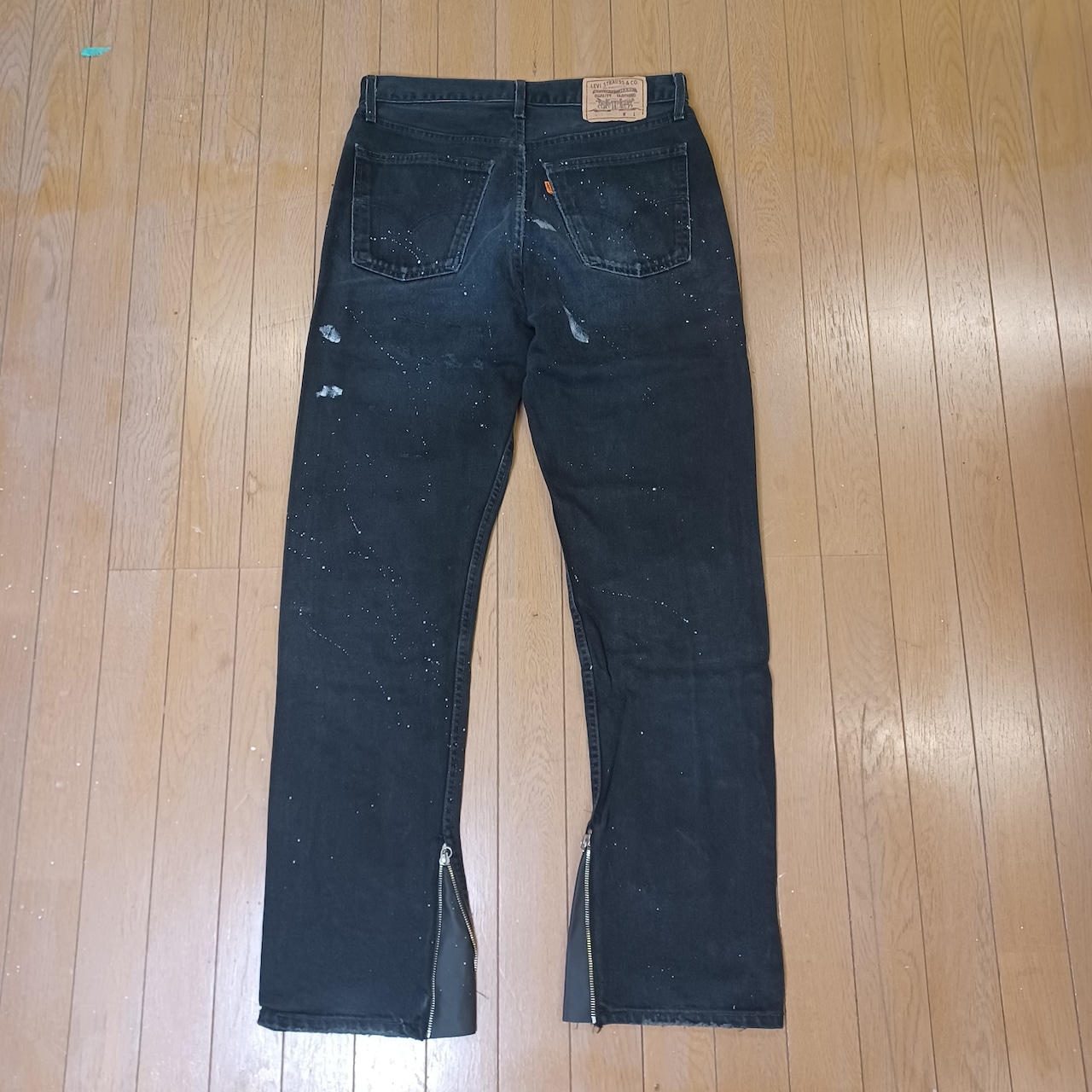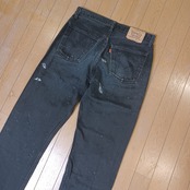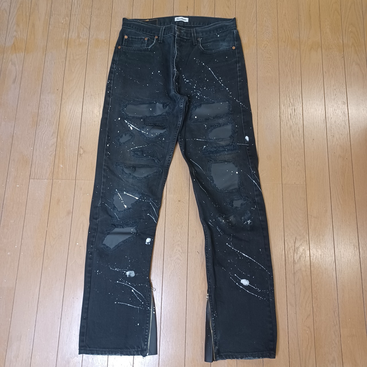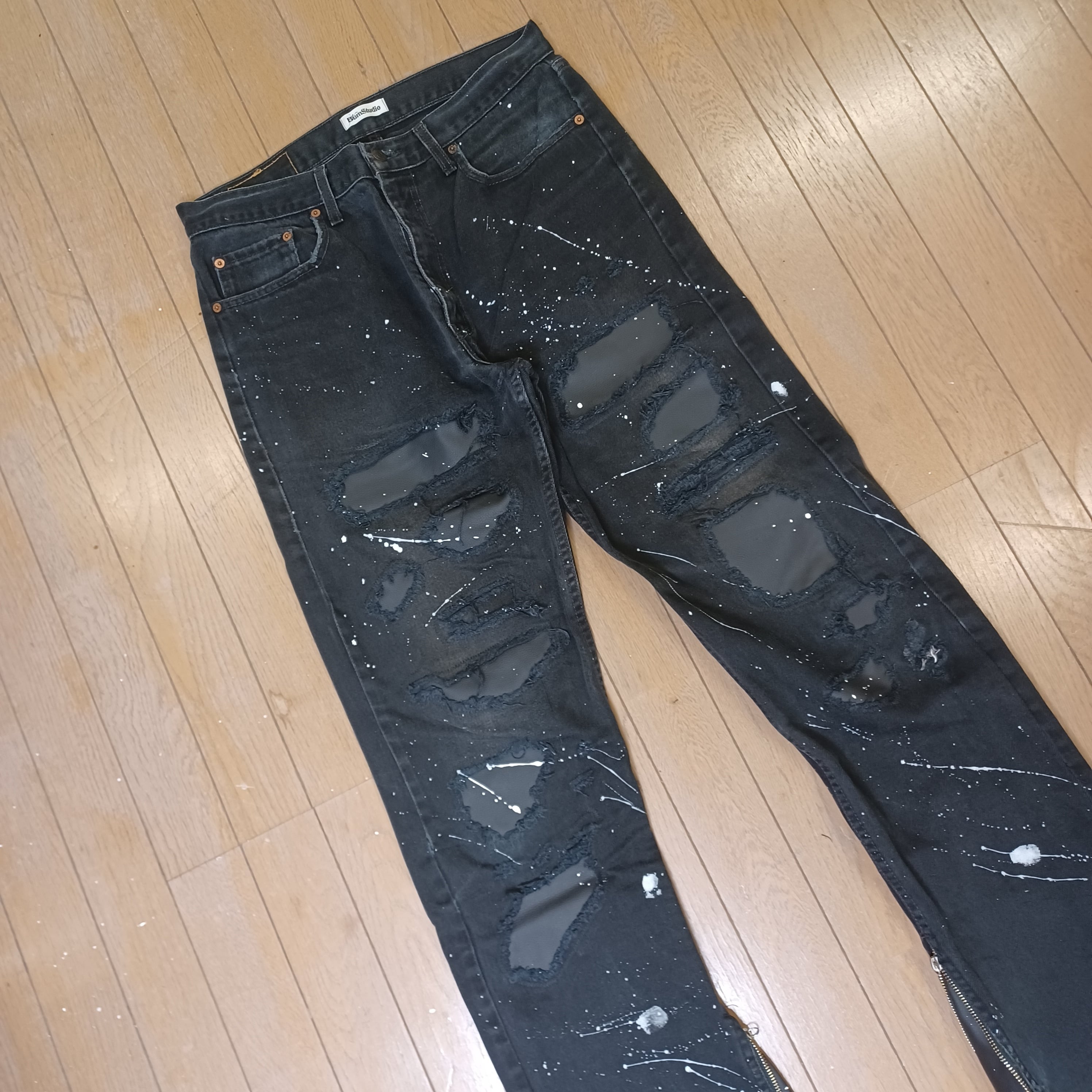 ヴィンテージLevi'sのブラックデニムをベースにダメージ加工、ミシン加工、ペイント加工を施しました。
