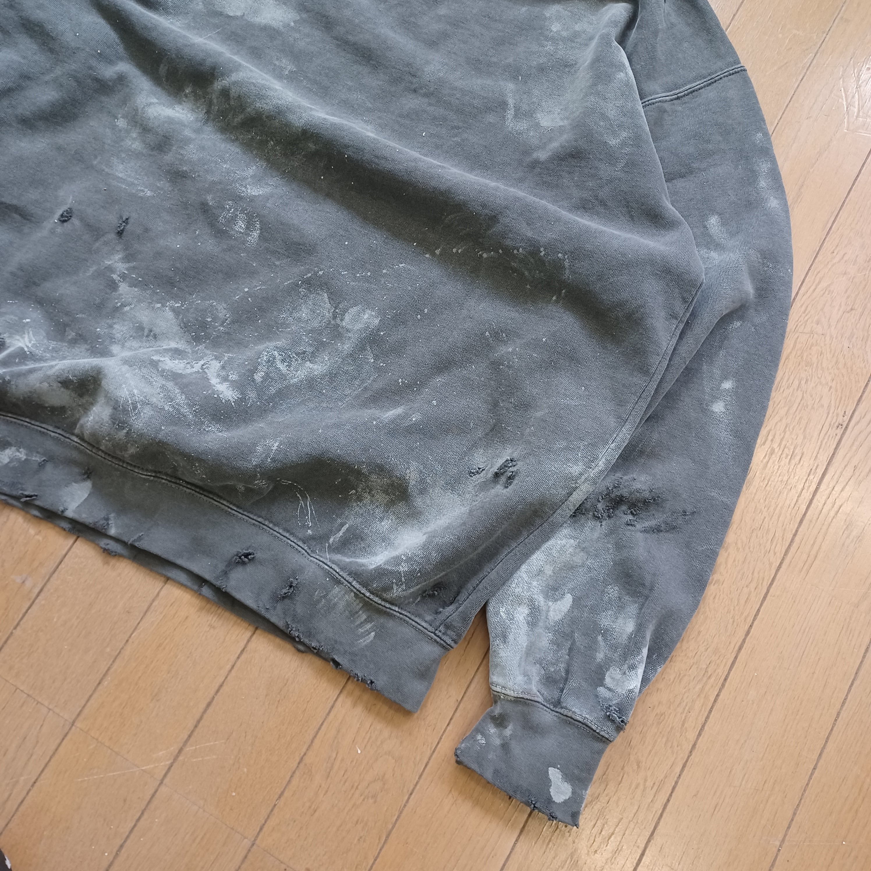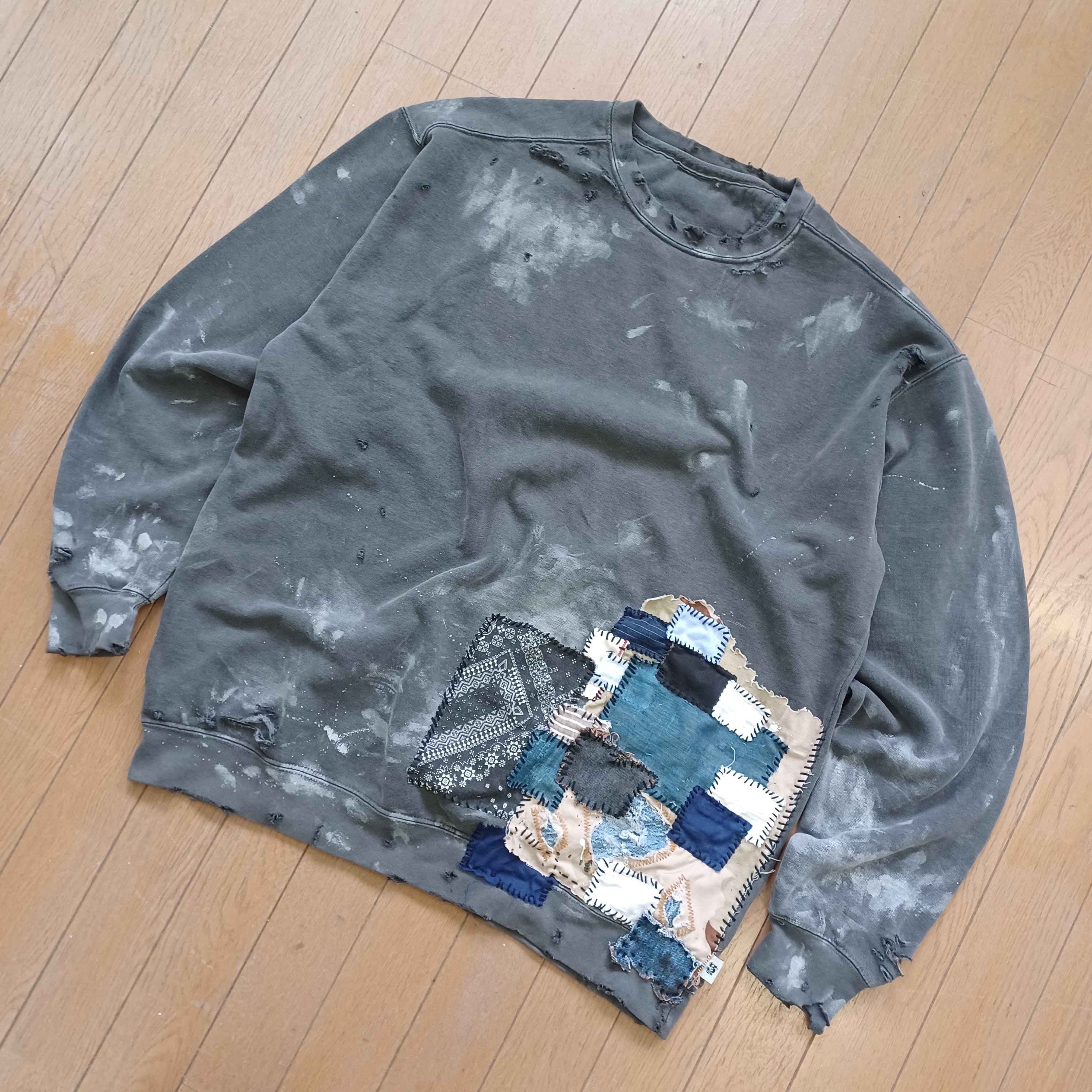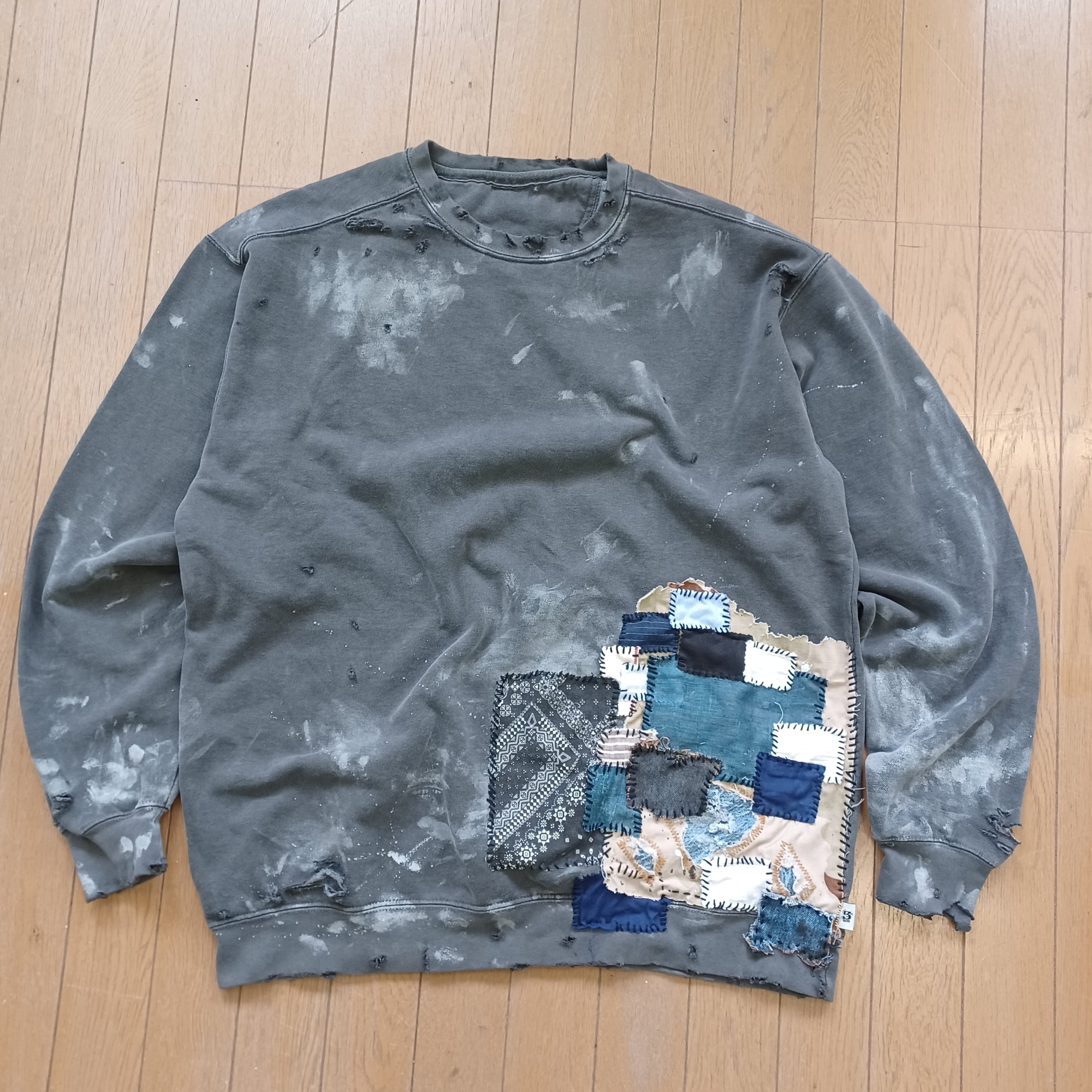 フェード掛かったスウェットシャツをベースにダメージ、ペイント、汚れ加工、そして刺し子縫いを施したスウェットシャツになります。